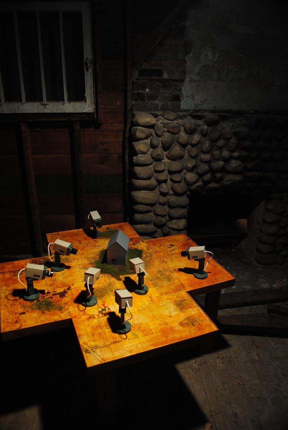 "Neighborhood Watch Program" | OSB, dummy security cameras (motion sensitive), survey maps, birch wood | 2010