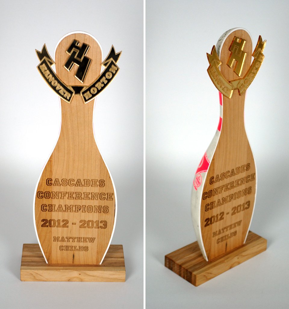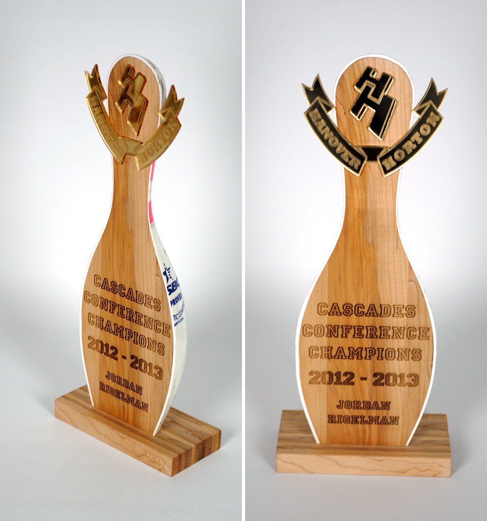 Tier 1 trophy | split bowling pin, maple base, gold mirrored acrylic | 2013