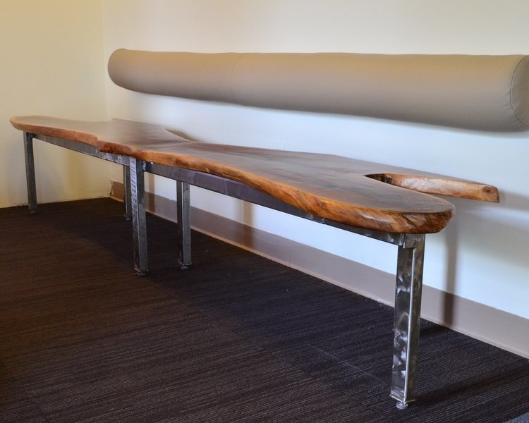The first two pieces, the bench and coffee table, were made from three slices of the same walnut tree. Two were joined to create a 9' book-matched bench. The third became a coffee table, each with a custom welded steel base.