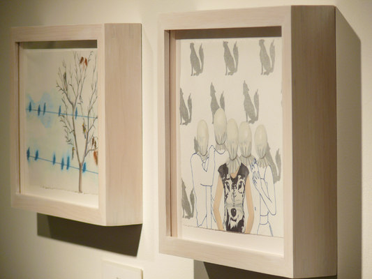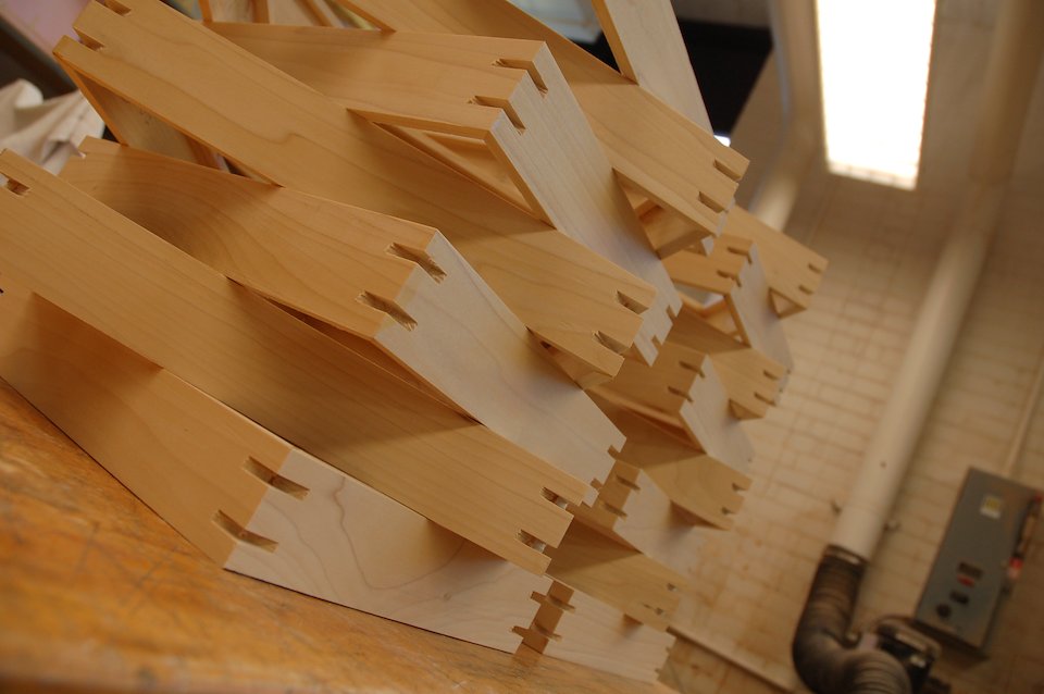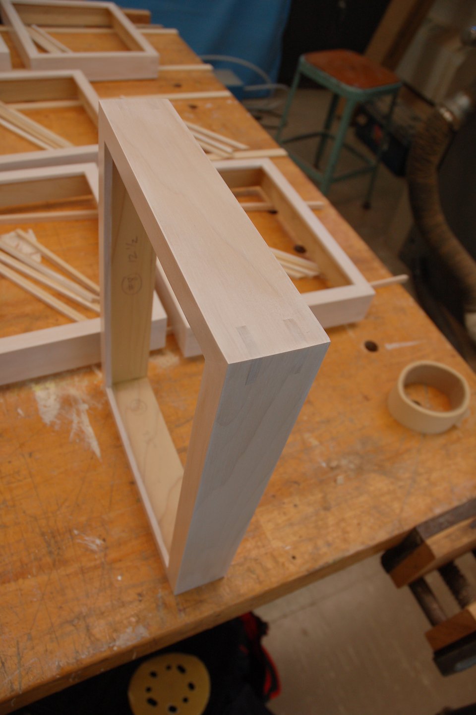 The frames are made of soft maple, using corner splines for added strength. They are finished using a white-wash pickling stain.