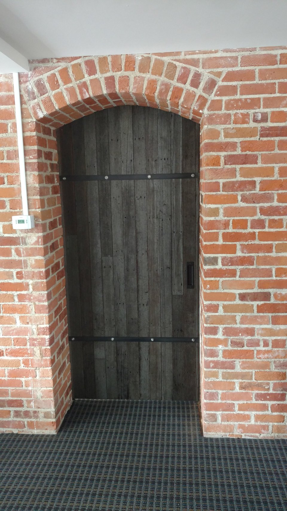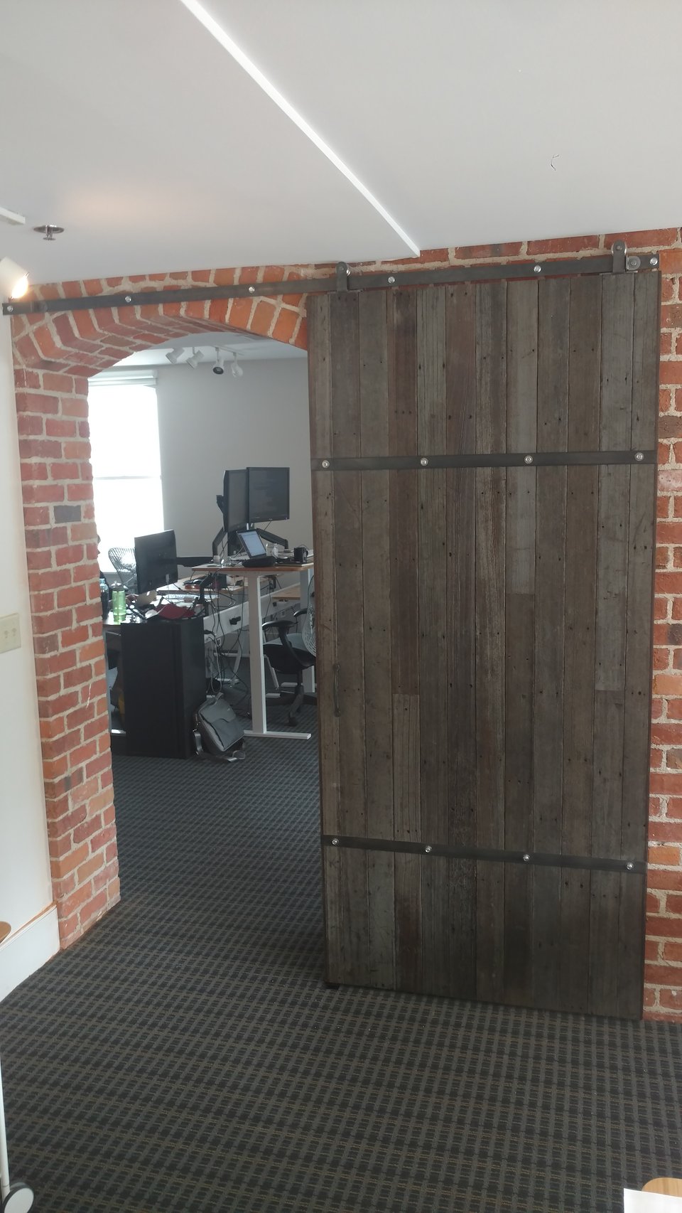 The next piece they wanted was a rustic barn door similar to the one we had done just a few month prior to separate the two main open office work spaces. Again, we used our reclaimed redwood decking.